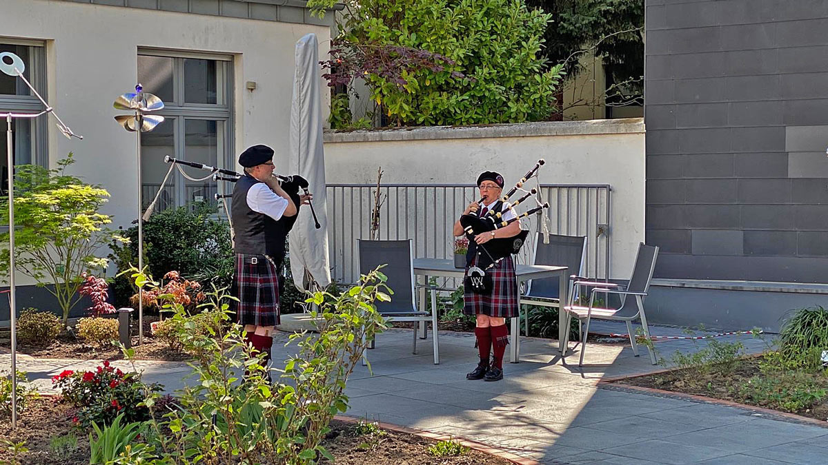 Für die Hospiz-Gäste spielten die Musiker ein Repertoire aus traditionellen Songs wie „Highland Cathedral“ oder anderen gut bekannten Liedern. Das Hospiz hatte das Kurz-Konzert kontaktlos organisiert: Die Musiker spielten im Garten, zwei Gäste konnten im sicheren Abstand hinzukommen und das Konzert im Hospiz-Garten genießen, der in den vergangenen Monaten komplett überarbeitet und verschönt worden ist. Andere Gäste verfolgten die Darbietung in ihren Zimmern über die Garten-Kamera.