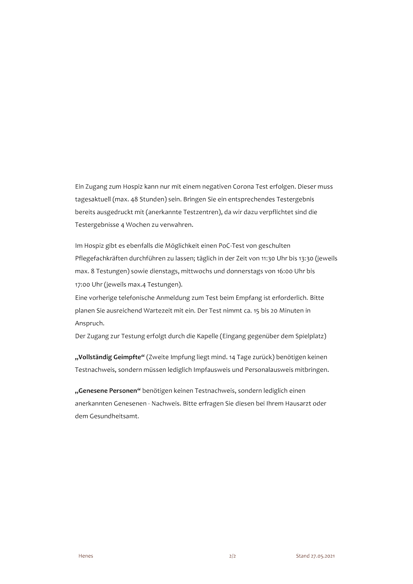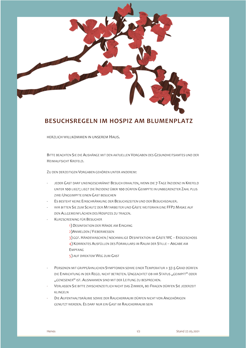 es gibt durch die neue Corona-Schutzverordnung auch bei uns im Hospiz Lockerungen in den Regelungen für Besucher. Dadurch ändern sich unsere Vorgaben – ein kleiner Schritt zu mehr Normalität.