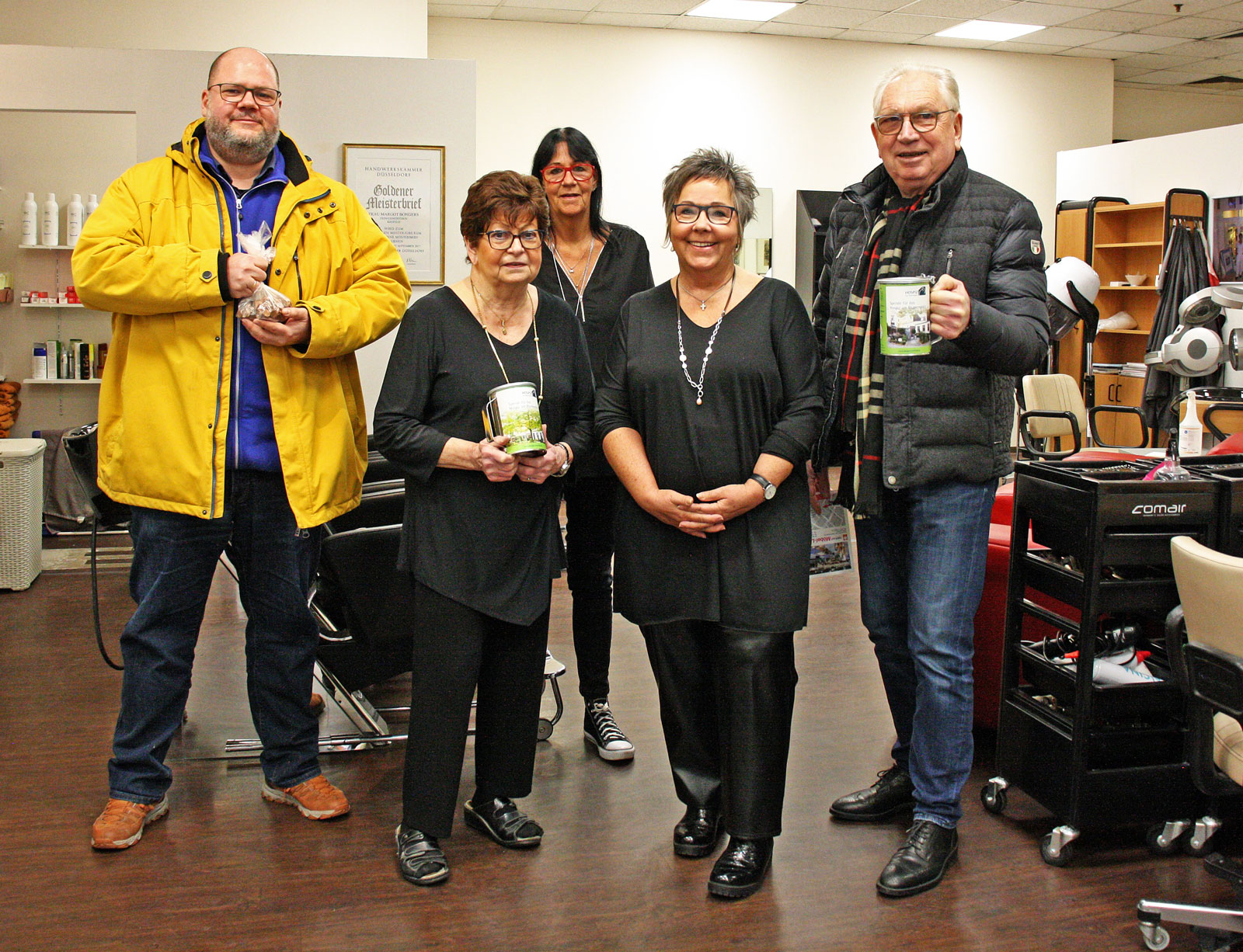 Dieser Besuch im Frühjahr ist eine lieb gewordene Tradition: Prof. Roland Besser (Vorsitzender Hospiz Stiftung Krefeld) und Alexander Henes (Gesamtleitung Hospiz) konnten jetzt wieder zum „Dosentausch“ zu Friseurmeisterin Margot Bongers und ihren Mitarbeiterinnen ins Hansa-Zentrum fahren.