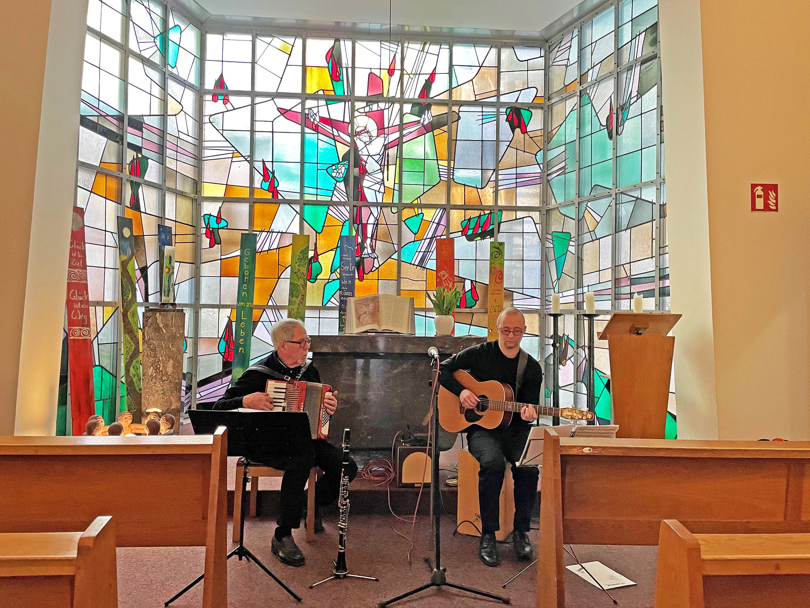 Wir bedanken uns ganz herzlich für diesen wunderbaren musikalischen Nachmittag: Die Hospiz Stiftung Krefeld konnte jetzt Karlheinz Uhlig und Christian Dierlich für ein spontanes Instrumental-Konzert in der Hospiz-Kapelle begrüßen. Die beiden hatten eigentlich geplant, mit ihren Bandkollegen aus der Gruppe Scherele ein Konzert zu geben – aus Krankheitsgründen musste der Plan jedoch kurzfristig geändert werden. Um die Hospiz-Gäste in den Zimmern und die Zuhörer:innen in der Kapelle nicht zu enttäuschen, stellten die beiden Musiker kurzerhand ihr Repertoire um. Sie spielten ein einstündiges Klezmer-Instrumentalkonzert – und berührten in dieser Form die Herzen des Publikums. Spannend waren auch die Geschichten und Informationen rund um diese besondere Musik aus dem ehemaligen osteuropäischen, jüdischen „Schtetl“.