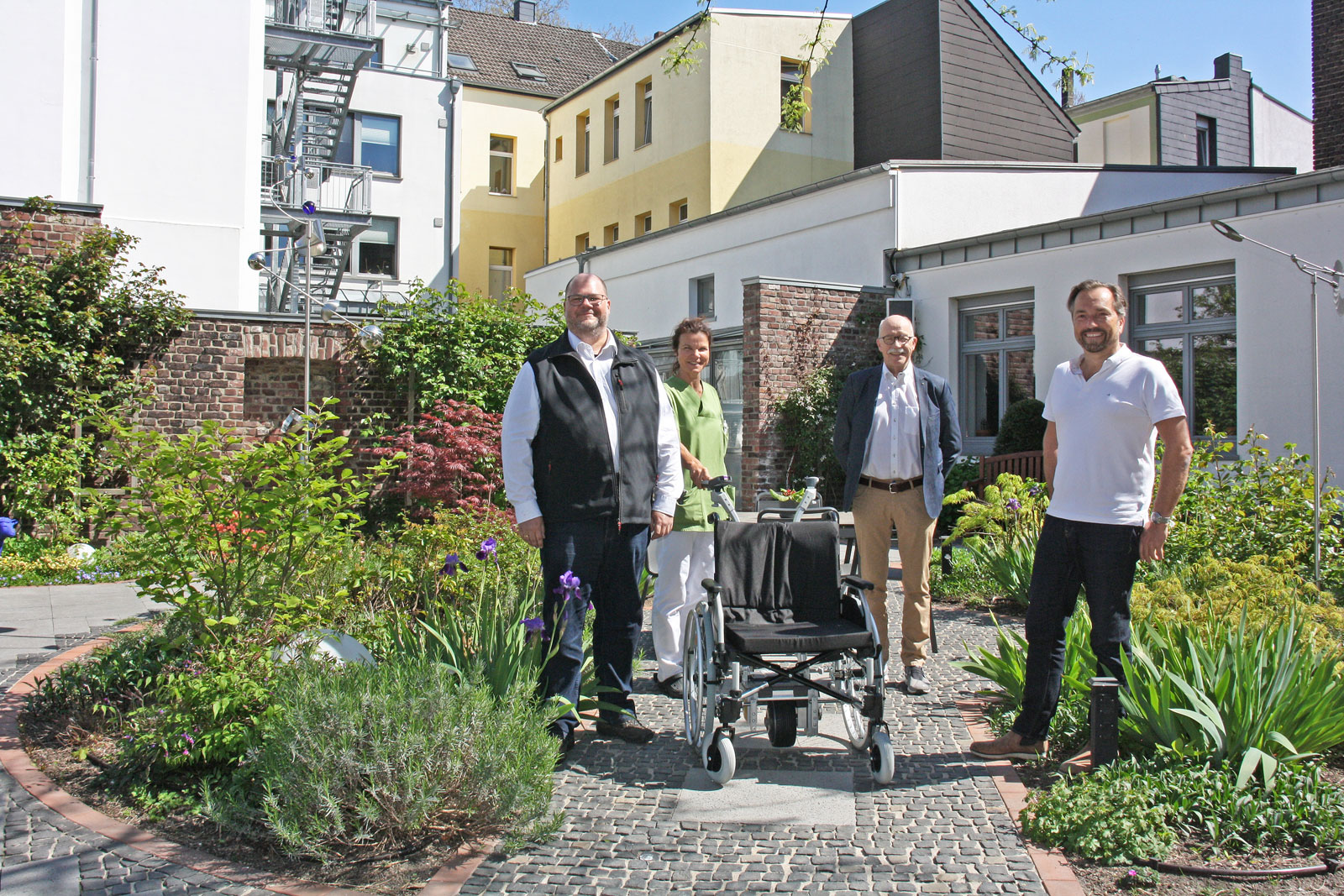 Als Vertreter des Lions Club besichtigten Dr. Helmut Stanek und Dr. Dirk Kraues die Neuanschaffung jetzt im Hospiz-Garten. „Der Rollstuhl wird über einen Akku-Motor unterstützt und hat rund 3 500,- Euro gekostet“, berichtete Hospiz-Leiter Alexander Henes. Helmut Stanek freute sich, dass die Unterstützung so gut ankommt: „Wir fördern gerne konkrete Projekte und arbeiten mit verschiedenen Krefelder Einrichtungen zusammen. Als unser Mitglied Dirk Kraues, der im Club Pate für das Erwachsenen- und das Kinderhospiz ist, uns von dem Wunsch berichtete, waren wir uns schnell einig, dass wir das unterstützen möchten.“ Der Lions Club sammelt bei verschiedenen Aktivitäten Geld für seine Benefiz-Projekte – etwa über eine Zahngold-Sammlung in Zusammenarbeit mit Zahnärzten oder beim Verkauf von Selbstgemachtem auf dem „besonderen Weihnachtsmarkt“ in Krefeld.