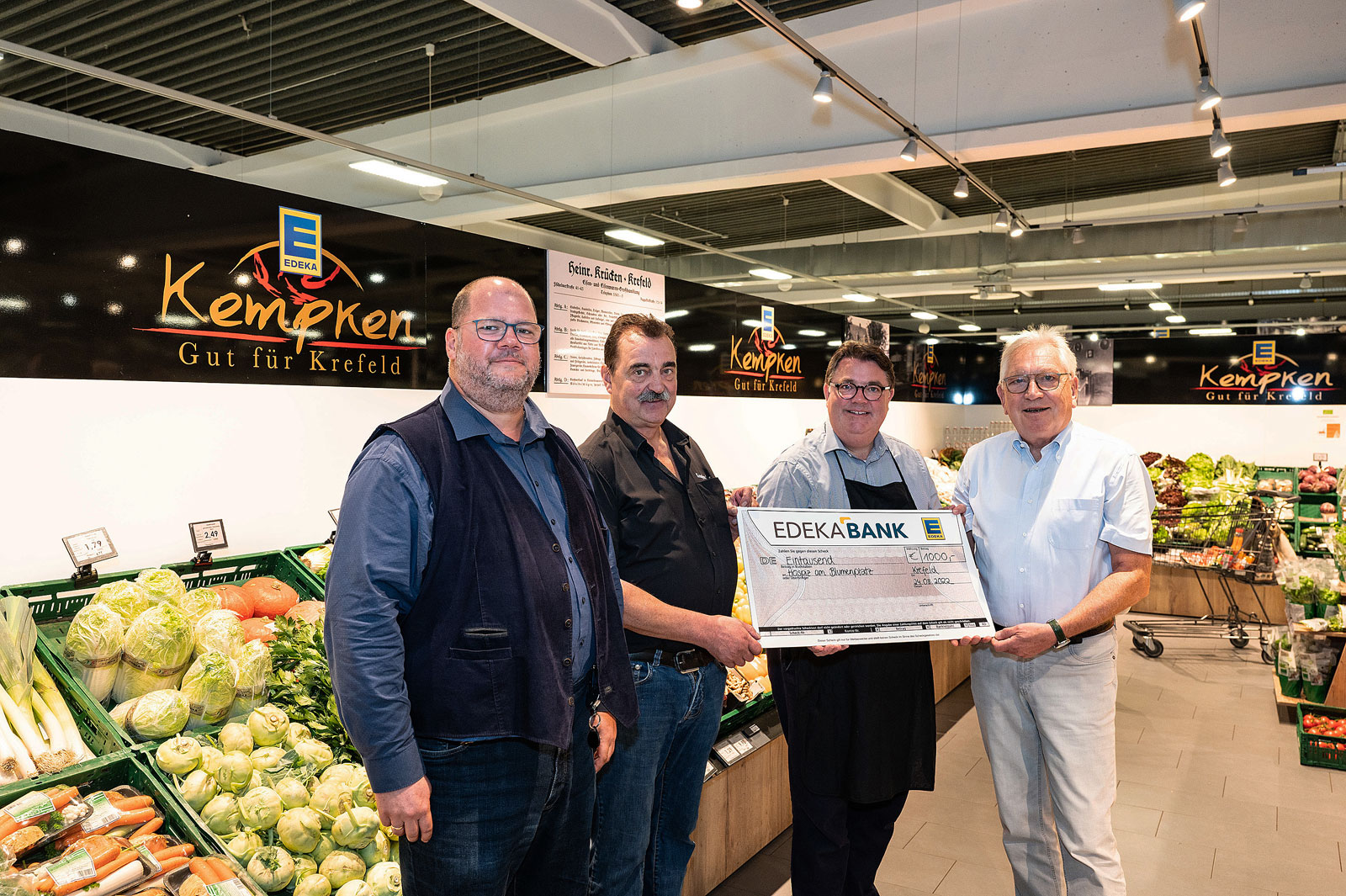 Am Ende der Benefiz-Aktion gingen 1000 Euro als Spende an das Hospiz am Blumenplatz, freuen sich Hospiz-Leiter Alexander Henes (v.li.), Edeka-Marktbesitzer Heiner Kempken, MdB Ansgar Heveling als Kassierer und Prof. Roland Besser (Vorsitzender Hospiz Stiftung Krefeld). Foto: Jakob Hoh