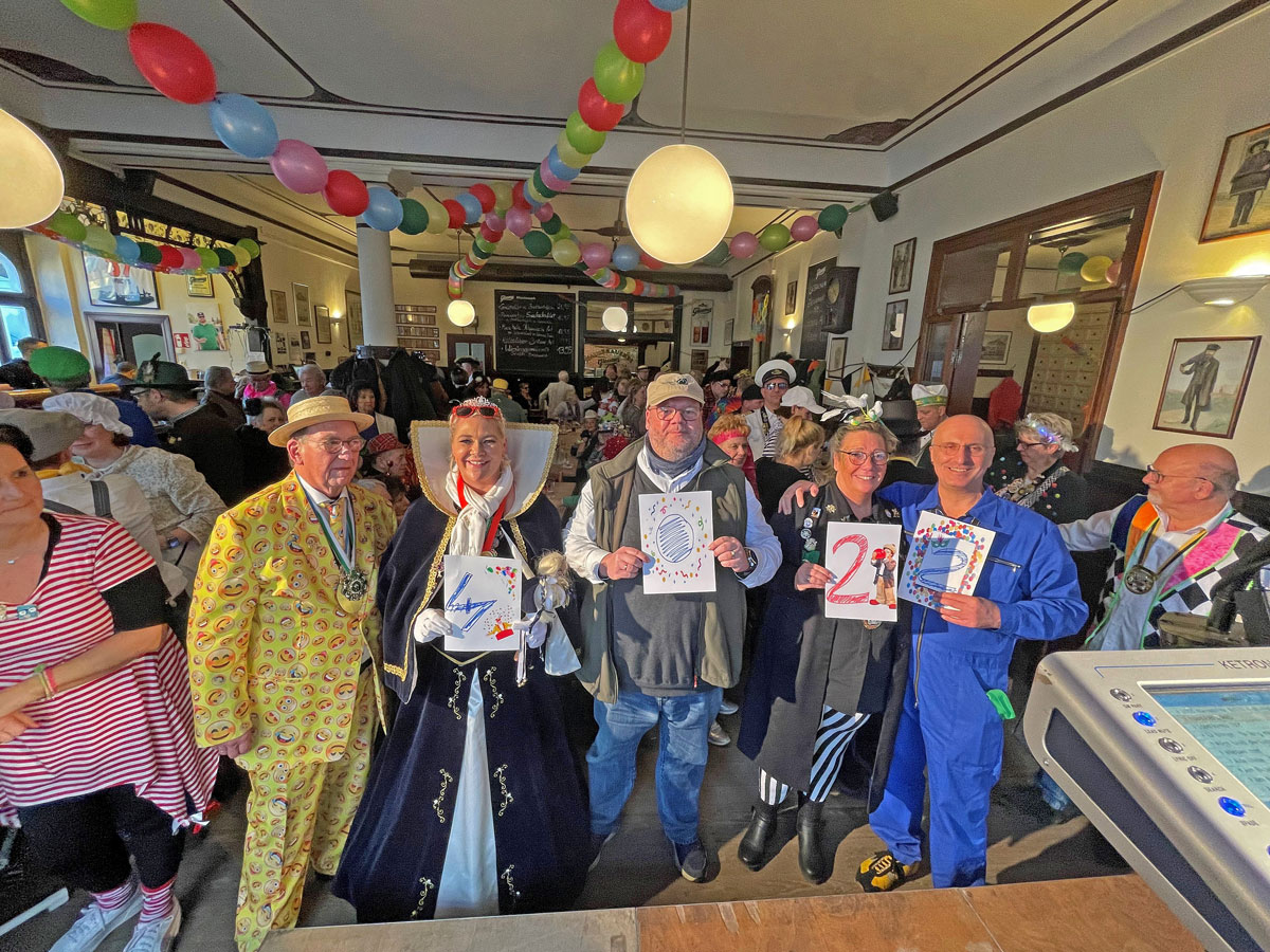 „Es war 2017 eine kleine verrückte Idee“ – so beschreibt Herbert Müller die Entstehungsgeschichte des „karnevalistischen Frühschoppens zum Mitsingen“ zugunsten der Hospiz Stiftung Krefeld. Diese „kleine Idee“ fand am Sonntag, 16. Februar 2025, jetzt bereits zum siebten Mal bei Gleumes statt – und brachte den beeindruckenden Spendenerfolg von genau 4240,50 Euro für die Hospiz-Arbeit der Hospiz Stiftung Krefeld. Damit war Müllers Wunsch, die 4 an der Spitze einer vierstelligen Summe zu erreichen, erfüllt. Das war auch gelungen, weil das Uerdinger Prinzenpaar Dirk III. und Lina I. kurz vor Ende des Frühschoppens am Nachmittag noch die jecke Summe von 222 Euro spendeten.