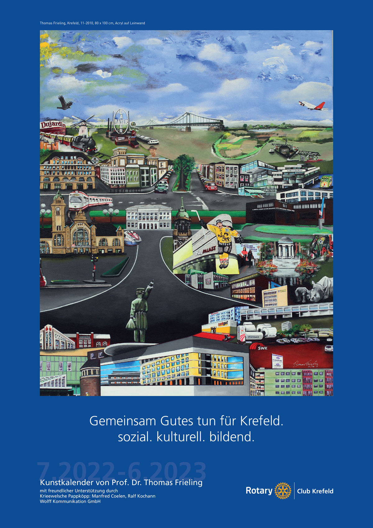 Unter dem Motto „Gemeinsam Gutes tun für Krefeld. sozial. kulturell. bildend.“ und anlässlich des 85-jährigen Bestehens veröffentlicht der Rotary Club Krefeld für das rotarische Jahr Juli 2022 bis Juni 2023 einen Kunstkalender des Krefelder Künstlers Prof. Dr. med. Thomas Frieling.