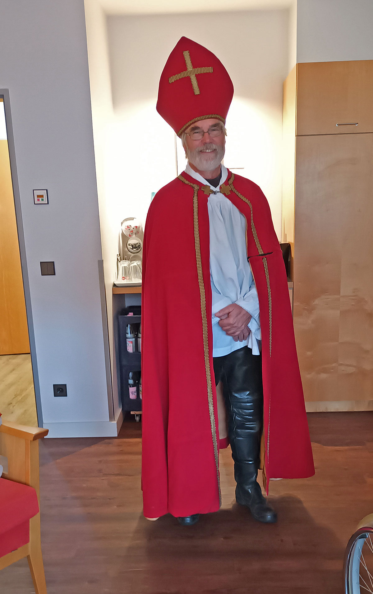 Bevor es für ihn zum Laternen-Umzug mit den Kindern auf die Straßen in Krefeld ging, besuchte St. Martin am Freitag (8. November) auch das Hospiz am Blumenplatz und erfreute die Gäste in ihren Zimmern. Er wurde begleitet von Elisabeth Bastians, der Koordinatorin für die Seelsorge. Als Geschenk brachte er für die Gäste einen Weckmann mit.