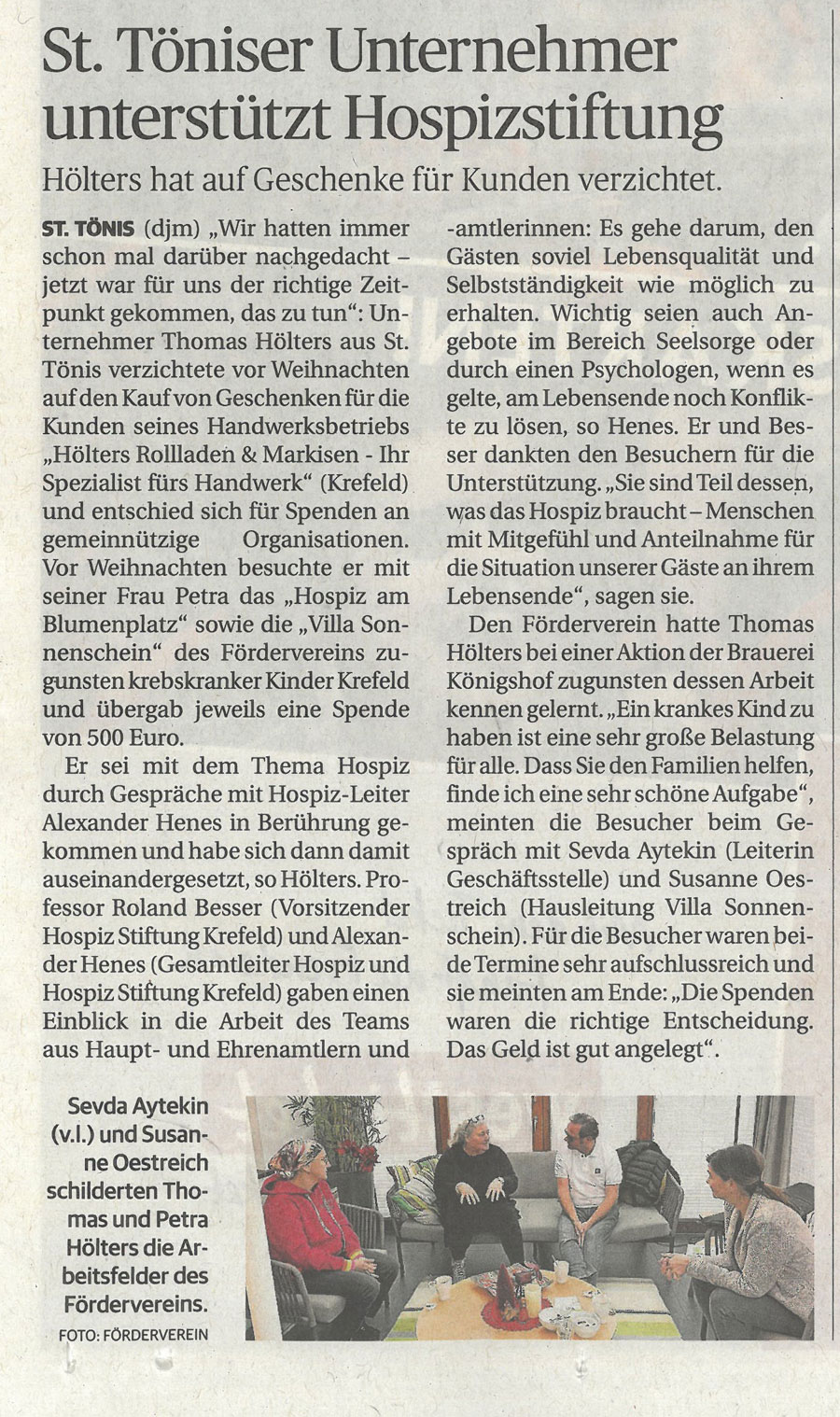 30 Dez. St. Töniser Unternehmer unterstützt Hospiz Stiftung Krefeld Rheinische Post; 30. Dezember 2023