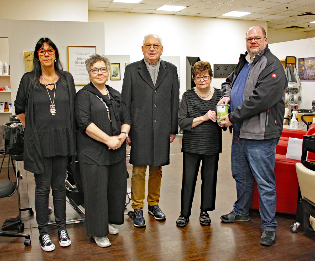 In den vergangenen Monaten haben wieder viele Kunden/-innen eine Spende für die Hospiz-Arbeit in Krefeld in die Spendendose gegeben, freuen sich Friseurmeisterin Margot Bongers (2.v.re.), ihre Mitarbeiterinnen Andrea Böttger (li.) und Gabi Zanders (2.v.li.) mit Prof. Roland Besser und Alexander Henes.